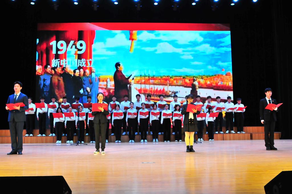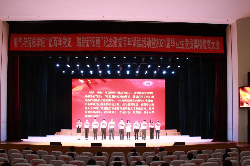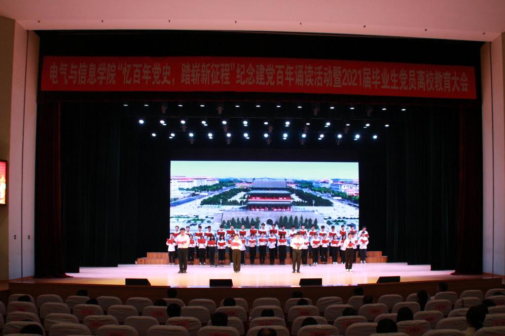 毕业生党员代表、在校生党员代表、团员代表和入党积极分子代表分别以党史时间轴,以配乐诗朗诵的形式演绎了“雄关漫道真如铁(1921-1949)”“人间正道是沧桑(1949-1978)”“东方风来满眼春(1978-2012)”“长风破浪正当时(2012-至今)”四个历史阶段,通过历史画面和声音,重现了中国共产党百年历程中的重大历史事件,让在场师生重温了中国共产党建党100年来的光辉历程,再一次接受了思想洗礼。