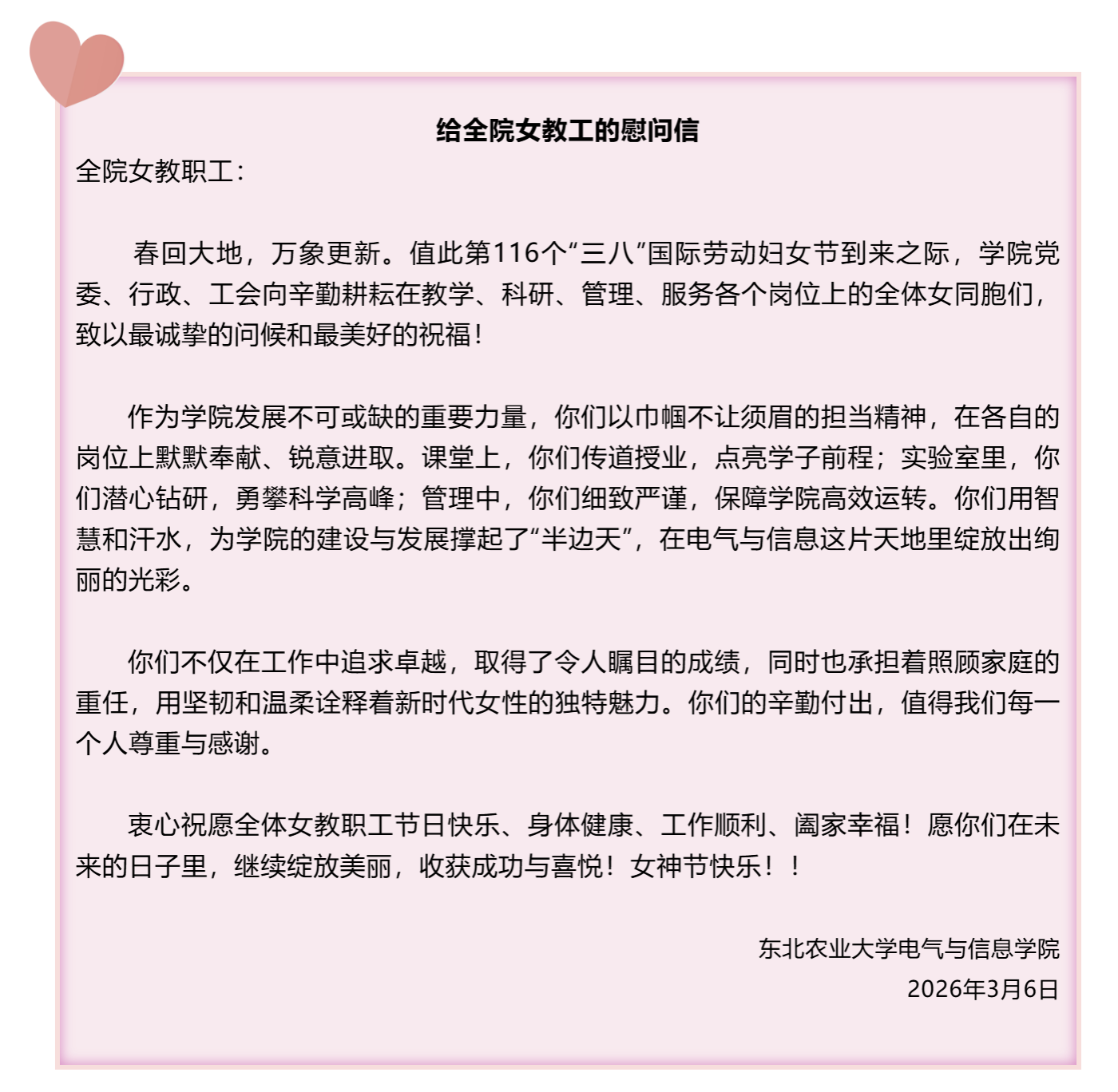 据悉,节日前夕,学院发布了《致全体女教职工的一封信》,以此慰问全体女教职工,并感谢他们在教学、科研及各项工作中发挥的积极作用和作出的重要贡献。