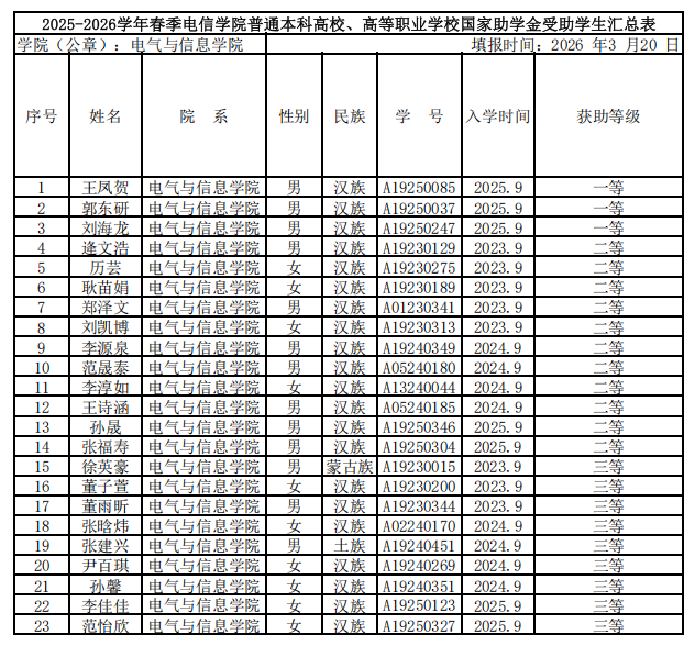 根据《黑龙江省财政厅 黑龙江省教育厅 黑龙江省人力资源和社会保障厅 黑龙江省退役军人事务厅关于印发<黑龙江省学生资助资金管理办法>和<黑龙江省学生资助资金管理实施细则>的通知》(黑财规〔2023〕7号)、《关于调整高等教育阶段和高中阶段国家奖助学金政策的通知》(财教〔2024〕181号)文件精神,根据学校、学院评选相关细则,经宣传动员、个人申报、班级评议、学院资格审查,现拟推荐王凤贺等23名同学获得2025-2026春季学期本科生国家助学金,现予公示。